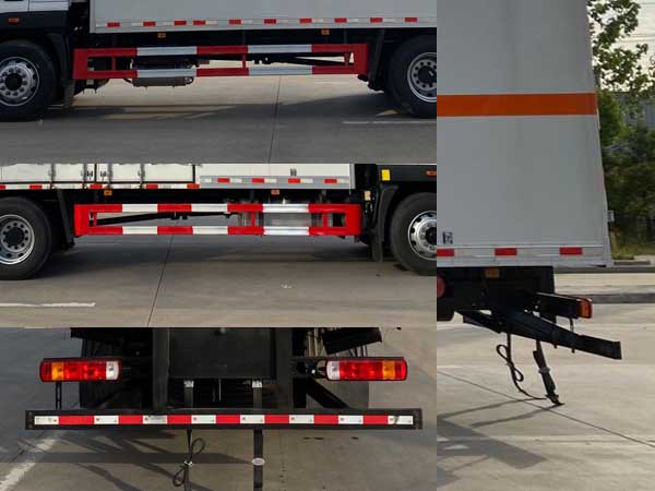 其它 | ABS型號:ABS-E,ABS/ASR-24V-4S/4M,CM4XL-4S/4M,3550D-1010;ABS生產(chǎn)企業(yè):威伯科汽車控制系統(tǒng)(中國)有限公司,東科克諾爾商用車制動系統(tǒng)(十堰)有限公司,廣州瑞立科密汽車電子股份有限公司,東科克諾爾商用車制動系統(tǒng)(十堰)有限公司;安裝有限速裝置;限速裝置限速(km/h):80;安裝有具有衛(wèi)星定位功能的行駛記錄儀;選裝描述:選裝側(cè)門型式及位置,選裝側(cè)門數(shù)量,選裝不開側(cè)門,廂體側(cè)面板選裝開百葉窗,選裝瓦楞板結(jié)構(gòu).該車型可選裝ETC車載裝置;發(fā)動機/油耗值(L/100km)對應(yīng)關(guān)系為:F4.5NS6B220/24.4,B6.2NS6B210/26;側(cè)后防護情況:側(cè)、后防護材料均為Q235,螺栓連接,后防護截面尺寸120×70mm,下邊緣離地高450mm;車廂頂部封閉且不可開啟;運輸獨立容器(瓶)包裝的貨物;危險貨物類項號:第3類;其他說明:僅選用排氣管前置、前輪盤式制動及子午線輪胎的底盤.該車轉(zhuǎn)向輪安裝輪胎爆胎應(yīng)急防護裝置,后軸采用空氣懸架.該車為危險貨物運輸車。選裝后尾板時,后防護材料為Q235,焊接,截面尺寸120×50mm,下邊緣離地高450mm。尾板收起狀態(tài)水平長度為290mm,尾板質(zhì)量為550kg。隨底盤選裝駕駛室;選裝燃油箱,電瓶,尿素罐,后處理,儲氣筒左右安裝位置。 | ||